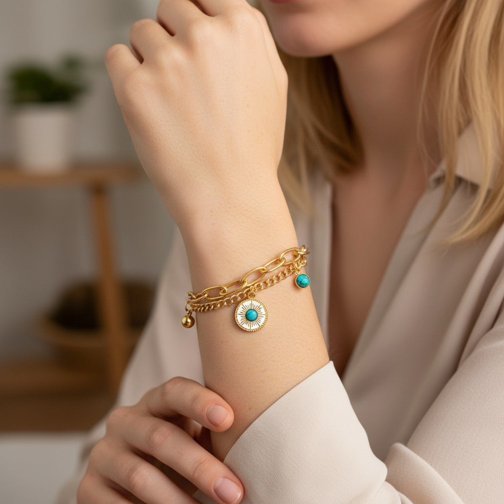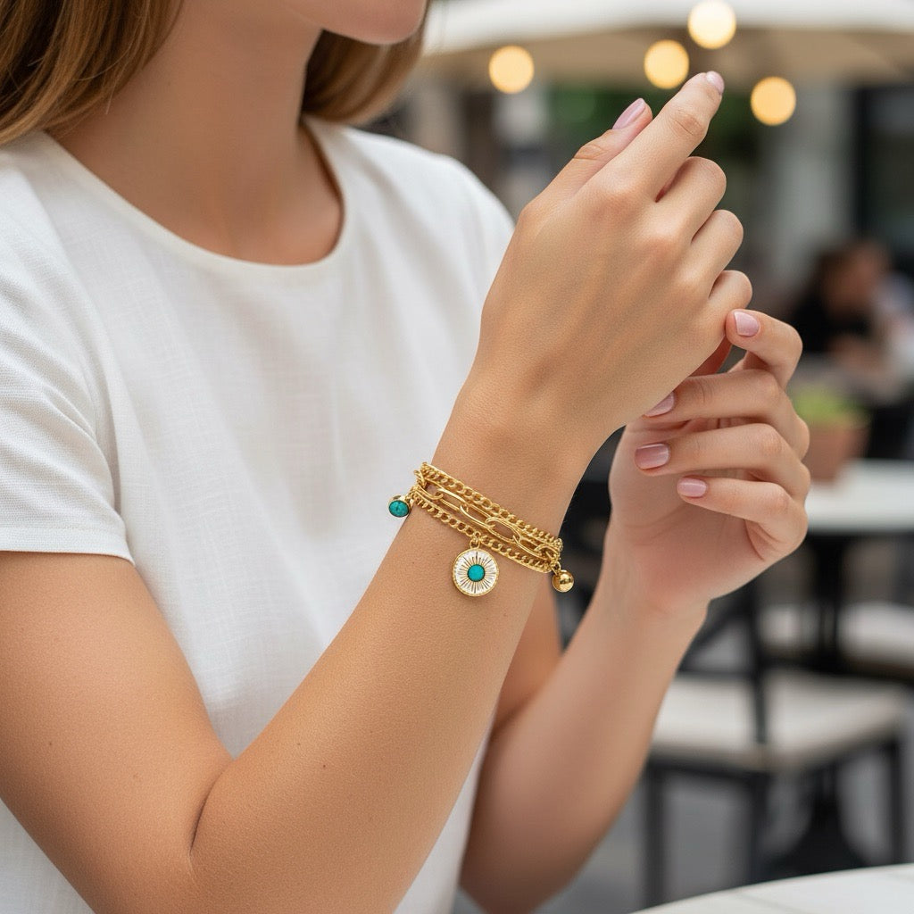 Bratara aurie, din otel inoxidabil, suflata cu aur 18k, cu pietre turquoise, Emma C3
