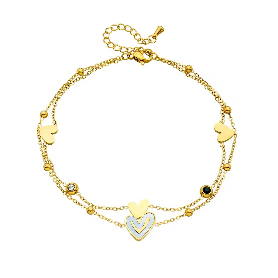 Bratara de picior, aurie, din otel inoxidabil, suflata cu aur 18k, cu inimioare si perlute, Abisai C4