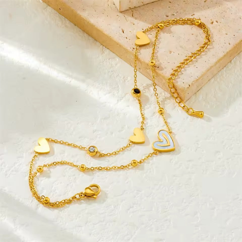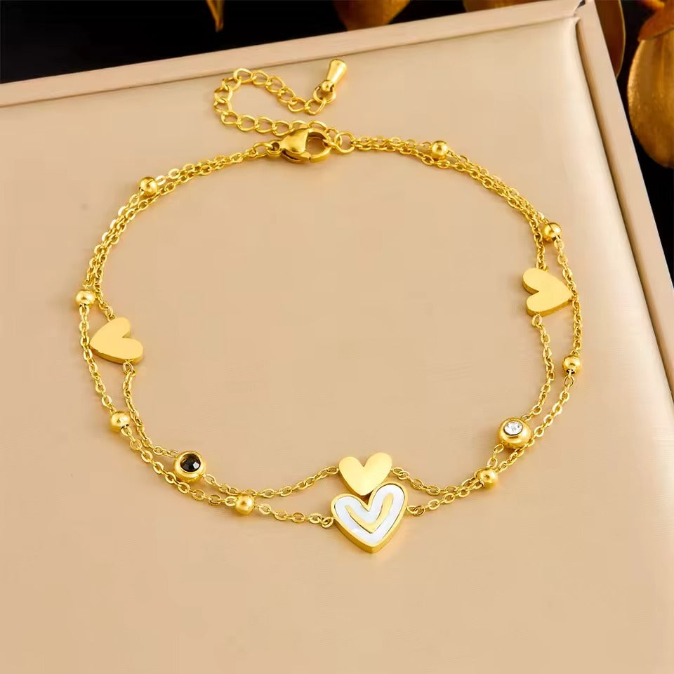 Bratara de picior, aurie, din otel inoxidabil, suflata cu aur 18k, cu inimioare si pietre, Abbygail C4