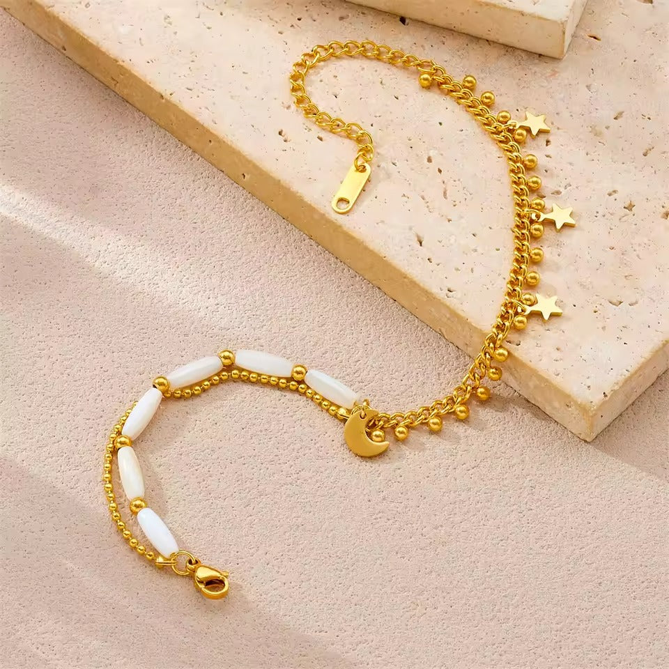 Bratara de picior, aurie, din otel inoxidabil, suflata cu aur 18k, cu semiluna, stea si margelute, Afrodite C4