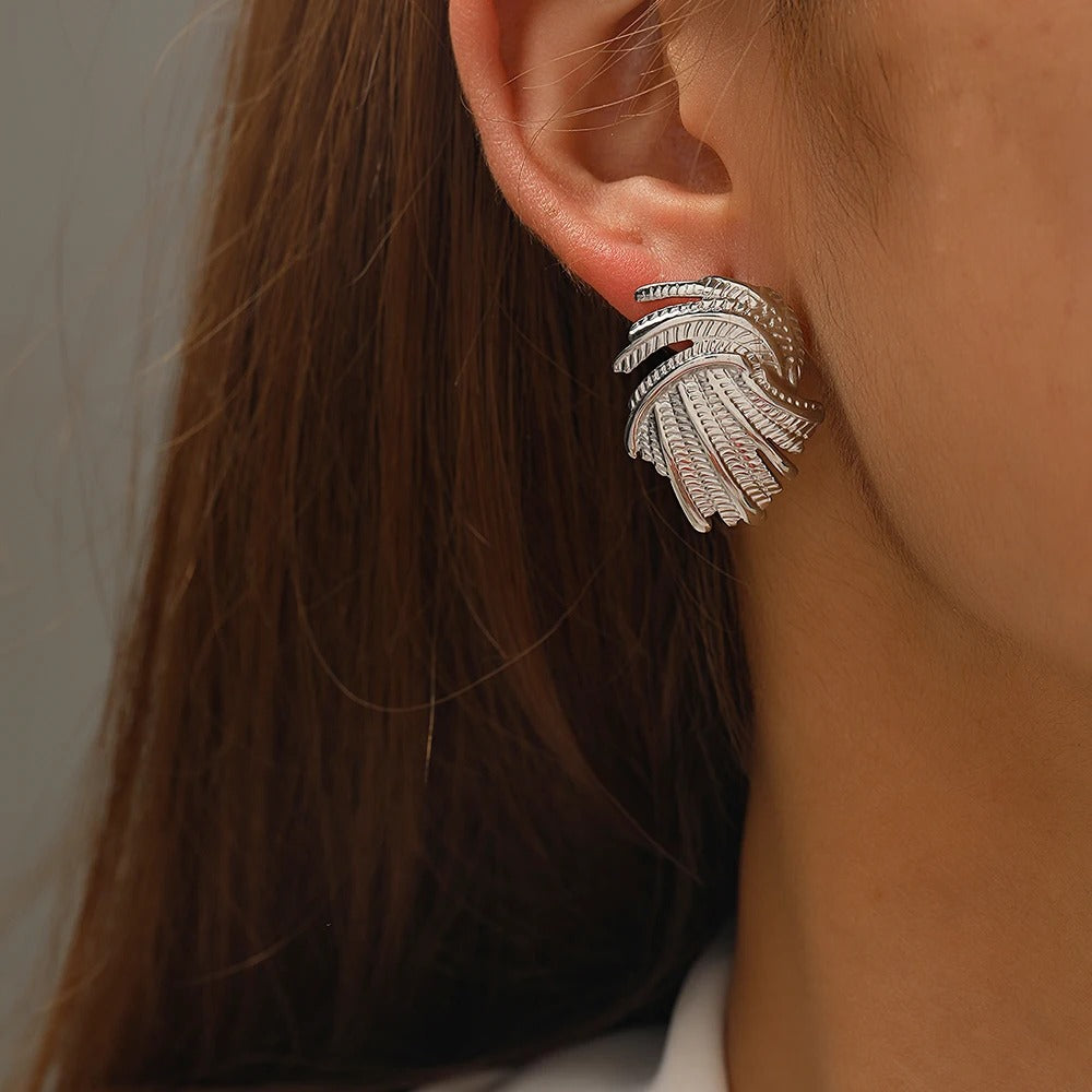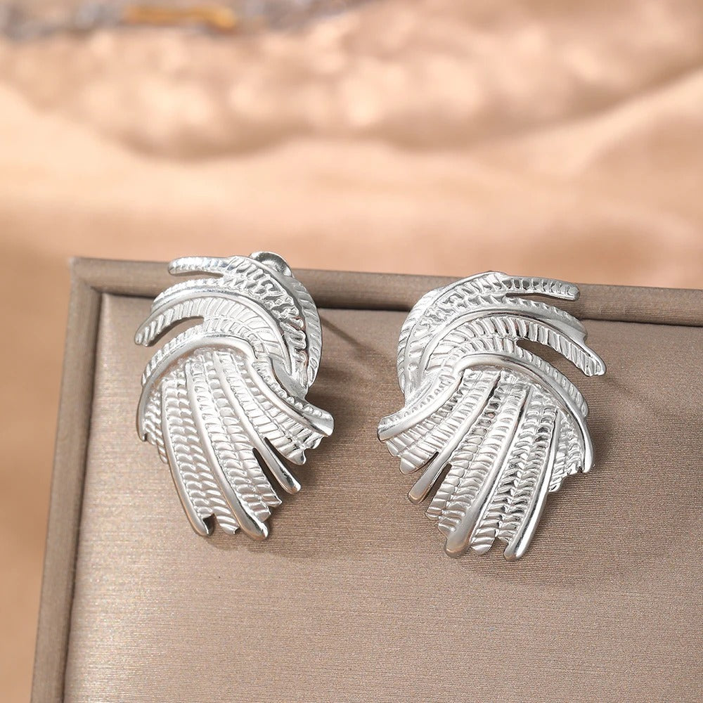 Cercei aurii, lungi, din otel inoxidabil, forma de frunzulite, suflati cu aur 18k, Denys C5