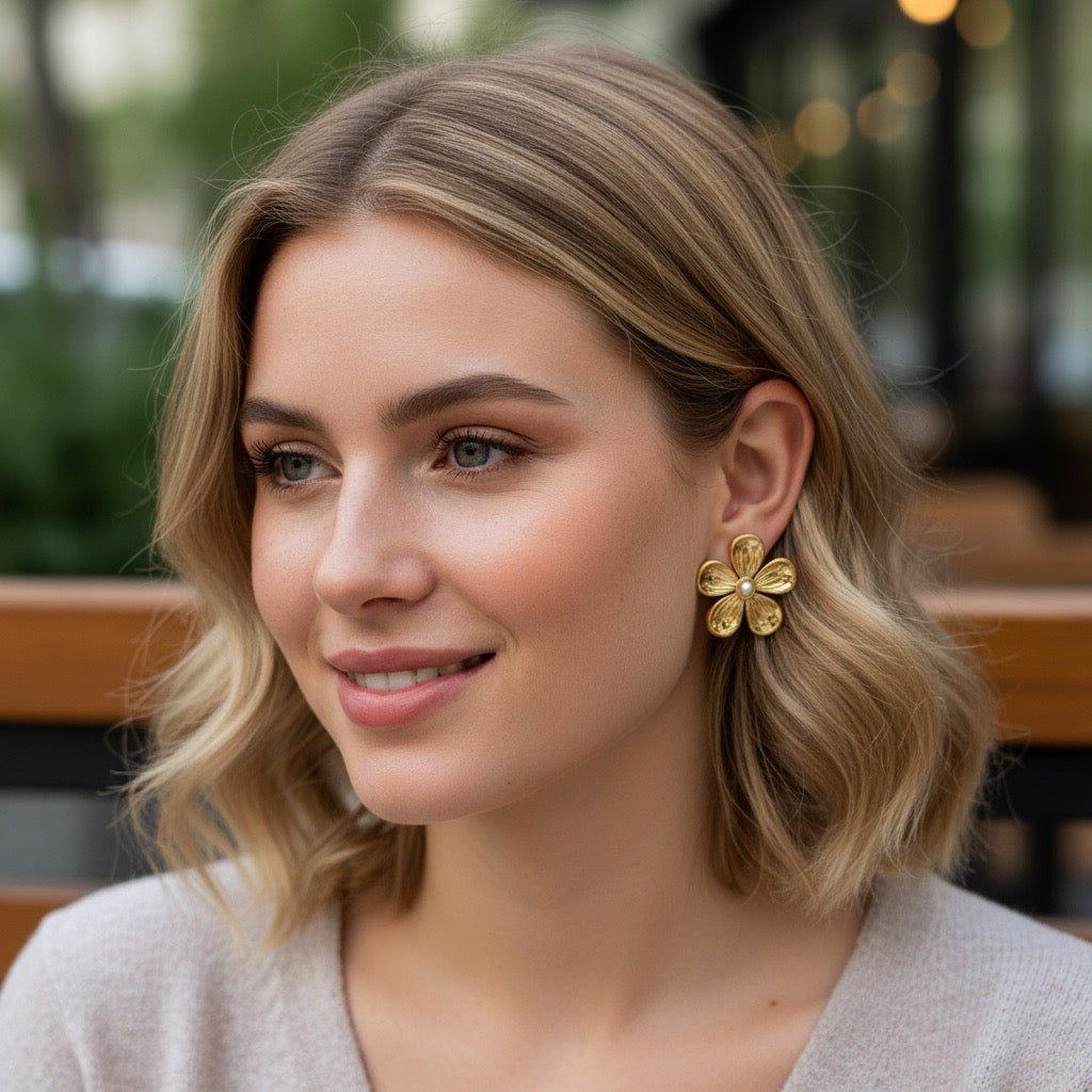 Cercei aurii, din otel inoxidabil, forma de floare, cu perlute, suflati cu aur 18k, Derek C5