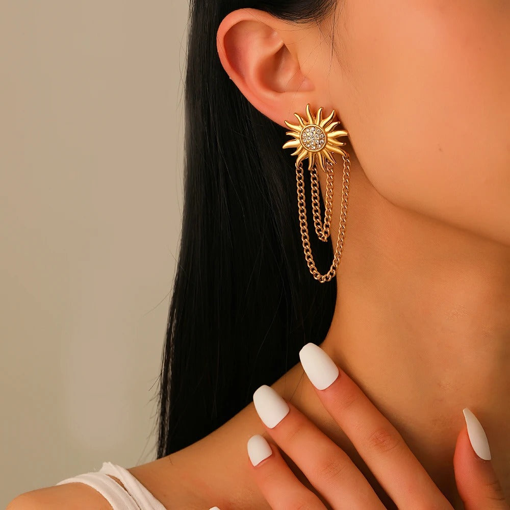 Cercei aurii, din otel inoxidabil, forma de soare, cu pietricele si lanturi, suflati cu aur 18k, Detmer C5
