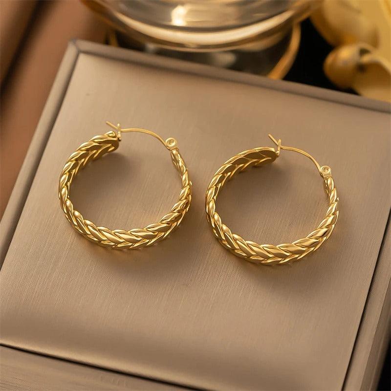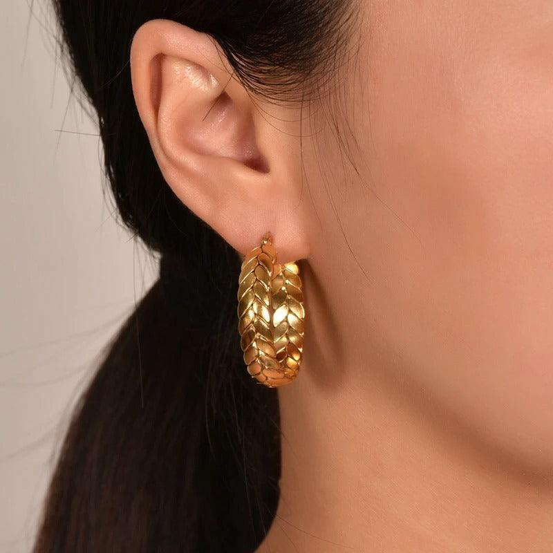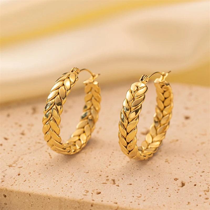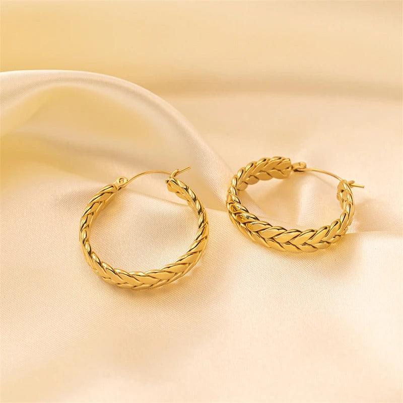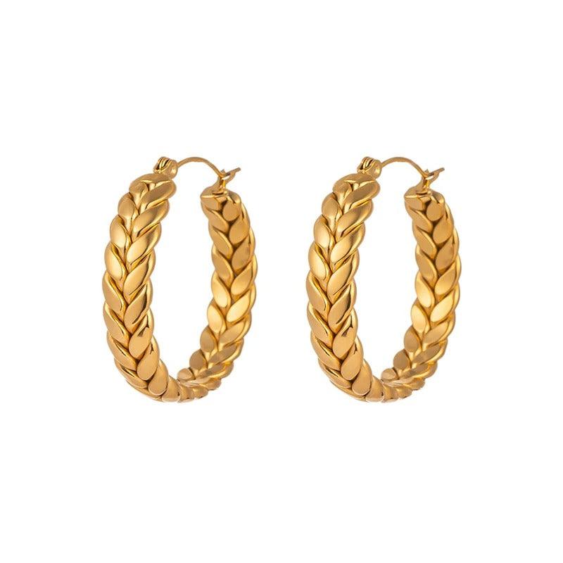 Cu un design rotund și împletit, cerceii Beatrice sunt alegerea perfectă pentru un look elegant cu personalitate. Realizați din oțel inoxidabil de calitate și suflați cu aur de 18K, acești cercei adaugă un plus de strălucire și textură ținutelor tale, de la casual la rafinat. Fiind rezistenți la apă și hipoalergenici, pot fi purtați cu încredere zi de zi, chiar și în vacanță sau la piscină.