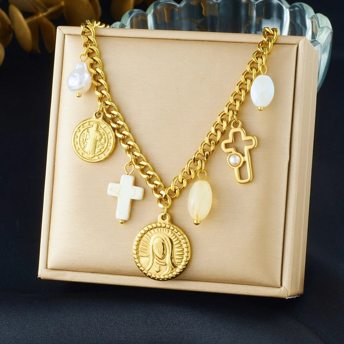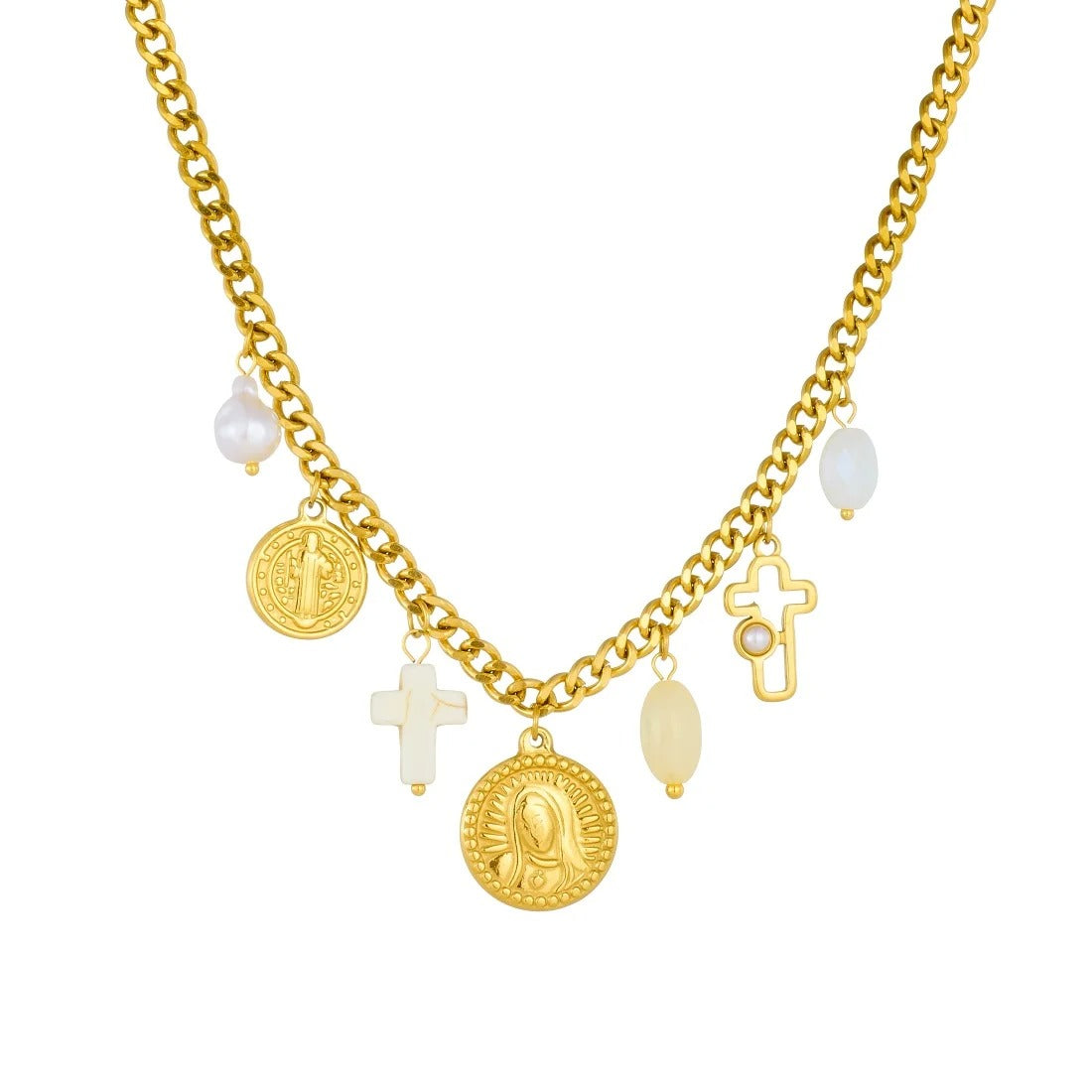 Colier auriu, din otel inoxidabil, suflat cu aur 18k, cu pandantive rotunde si cruciulite, Rika C5