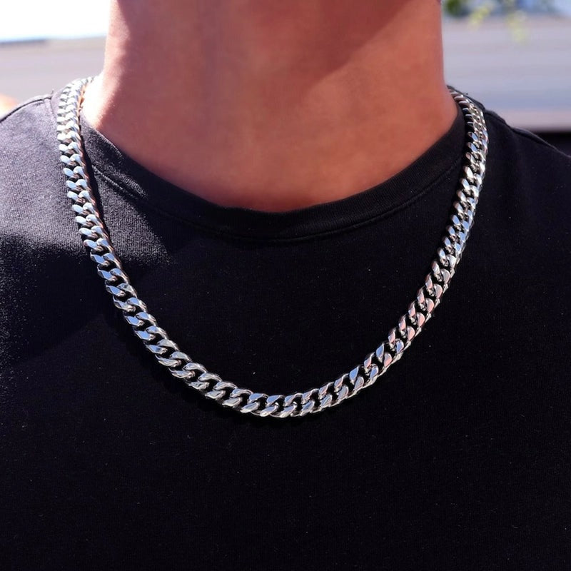 Colier cuban barbati, argintiu, din otel inoxidabil, suflat cu aur 18k, cu zale, Raimond C9
