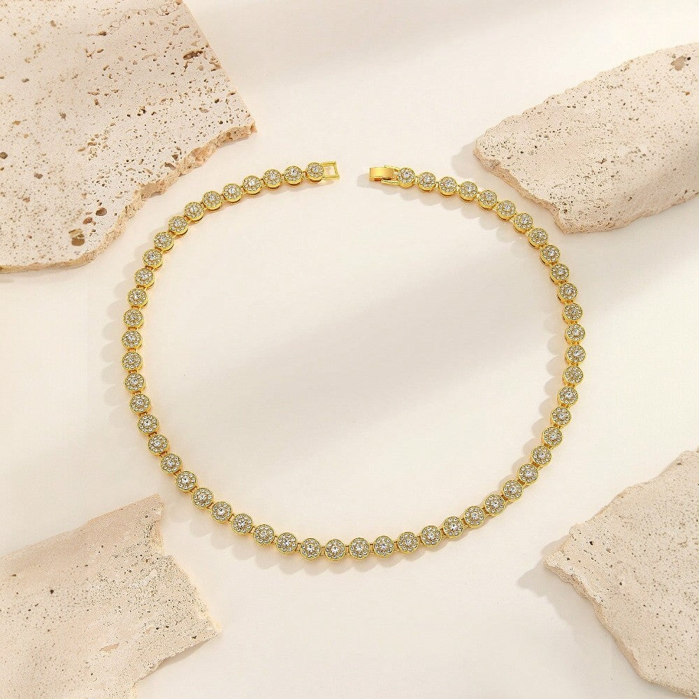 Colierul Clarah este definit de rafinament și simplitate elegantă, într-un design tennis clasic reinterpretat în tonuri aurii. Fiecare piatră din zirconiu este montată cu grijă într-un cadru rotund, pentru o strălucire uniformă și un efect sofisticat. Ideal pentru ținute de seară, evenimente speciale sau un look glam de zi.