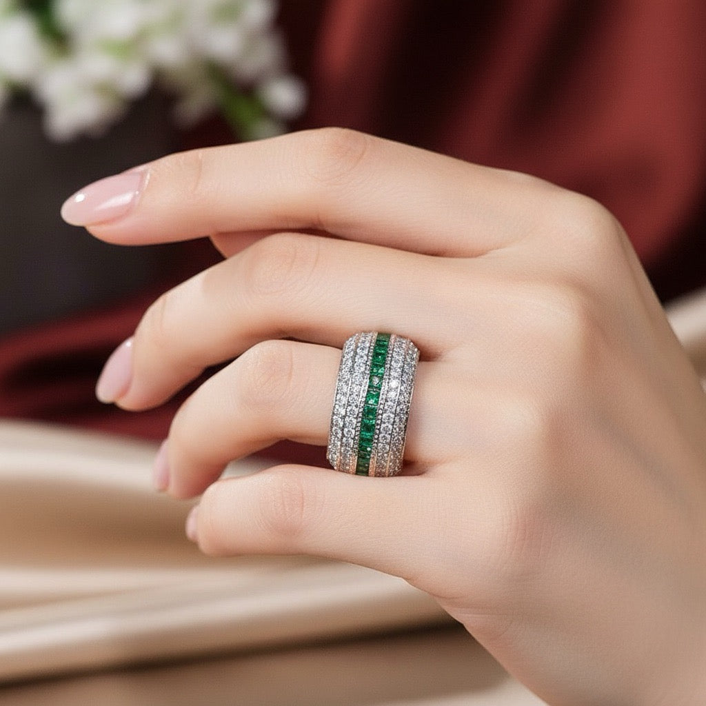 Cu un design lat și impunător, decorat cu pietre din zirconiu ce adaugă un plus de strălucire, inelul iese în evidență prin finisajul argintiu lucios și forma bine definită. Este realizat din cupru de calitate, fiind ușor și confortabil la purtare – ideal pentru ținute minimaliste, elegante sau cu aer modern.