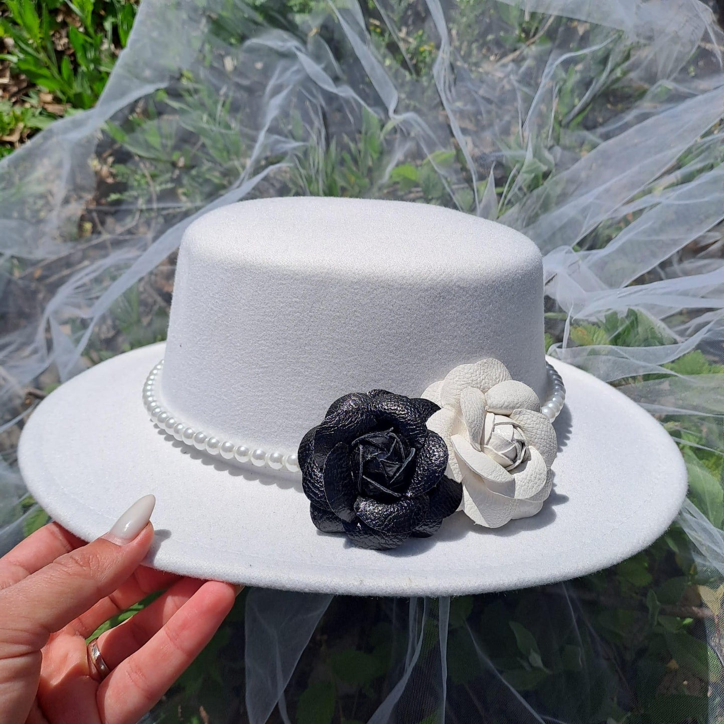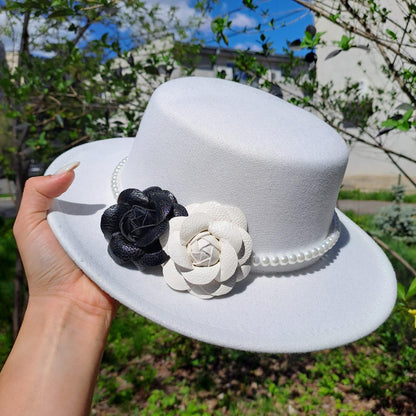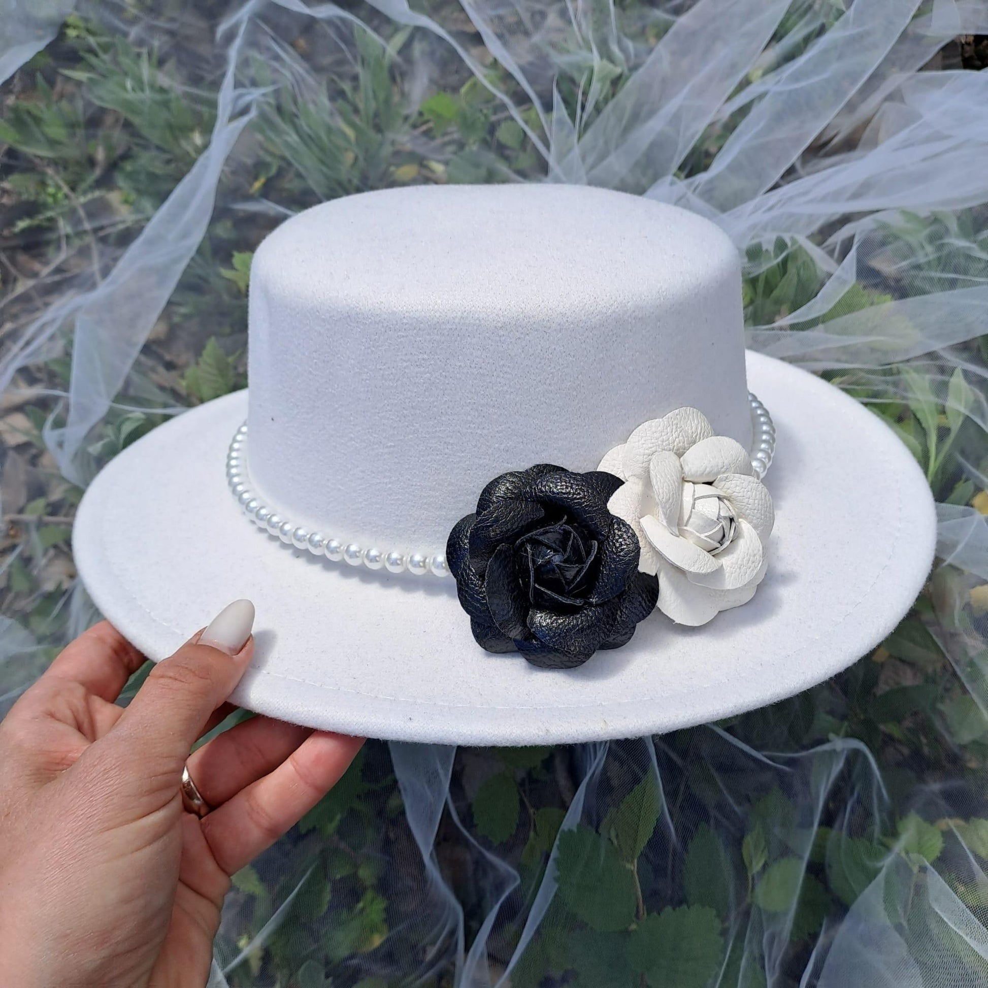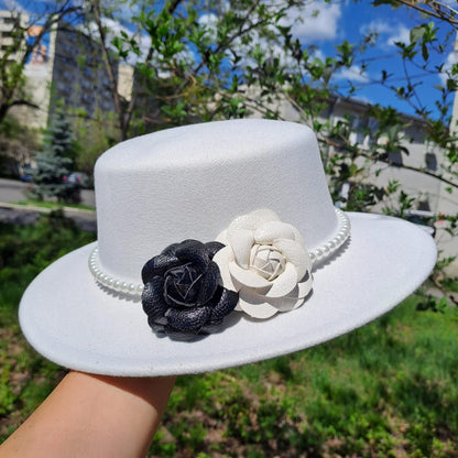 Palarie alba, stil canotiera, cu bor lat, handmade, cu flori si perle, Serafina