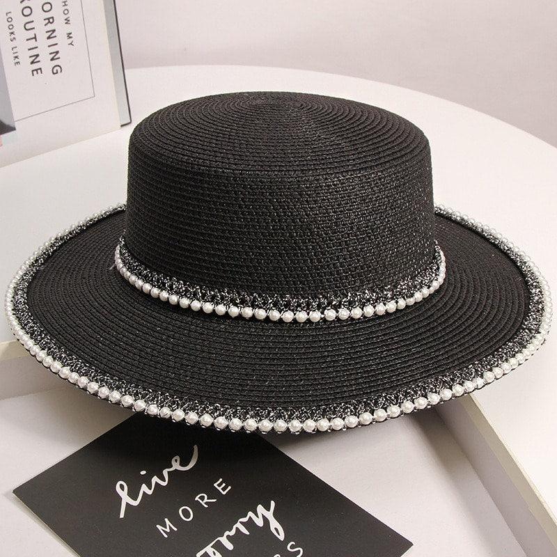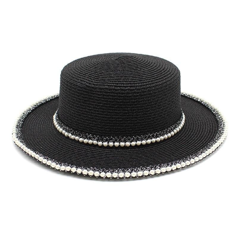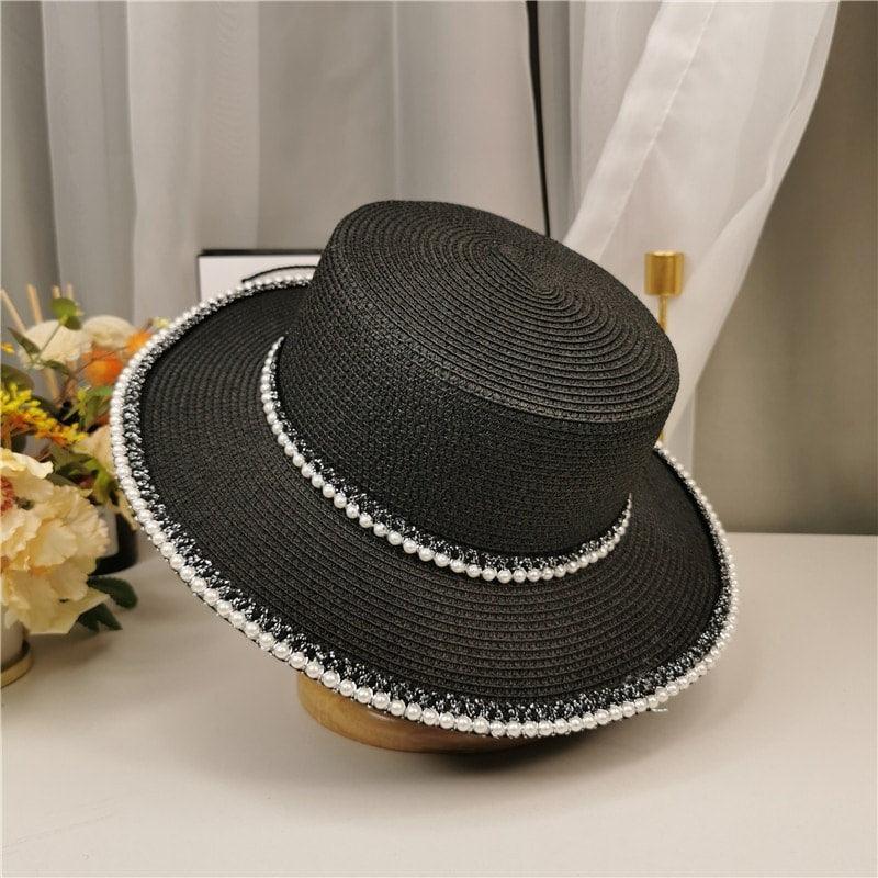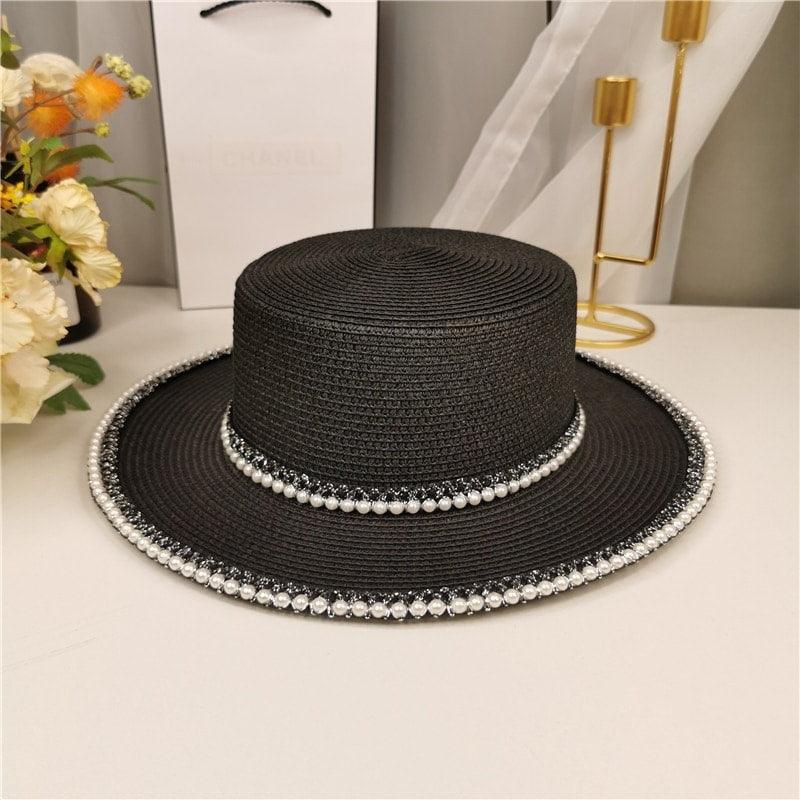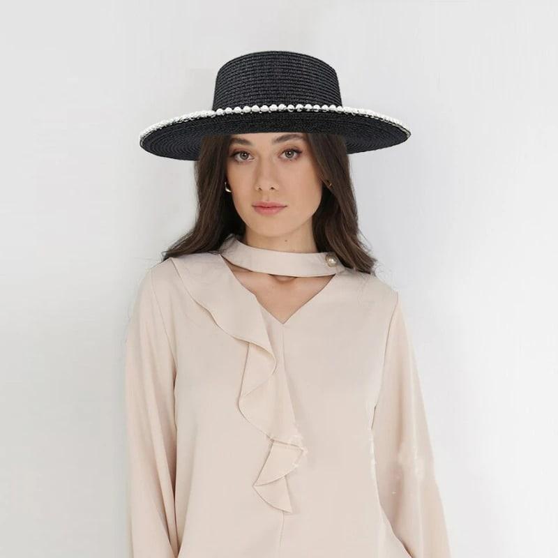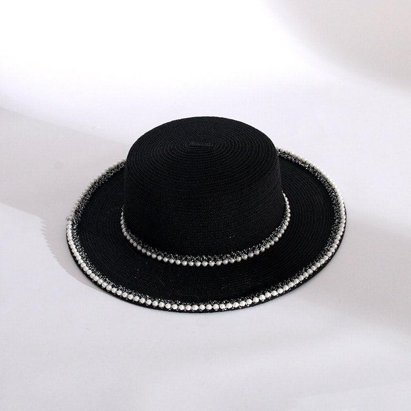 Palarie dama, neagra, de vara, stil canotiera, cu perle, Audrey