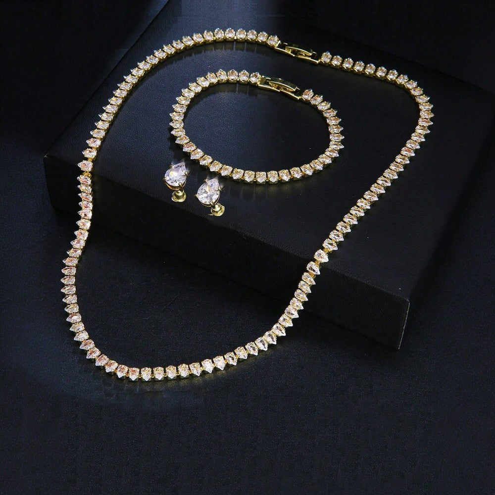 Strălucirea absolută capătă formă în setul Deana – un trio compus din colier tennis, brățară și cercei cu pietre din zirconiu. Fiecare detaliu este gândit pentru a evidenția eleganța purtătoarei, de la pietrele perfect tăiate în formă de lacrimă, până la montura aurie care le completează cu delicatețe. Realizat din aliaj metalic de calitate, acest set este ideal pentru evenimente speciale, gală sau ținute de seară.