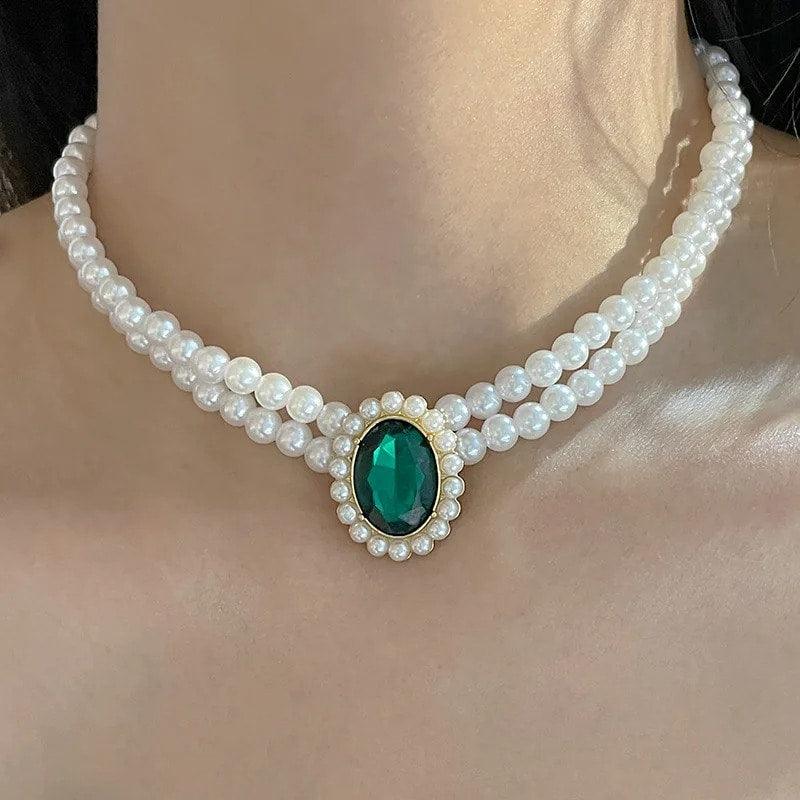 Decor: pietre verzi fațetate cu aspect regal, încadrate de mini-perle albe