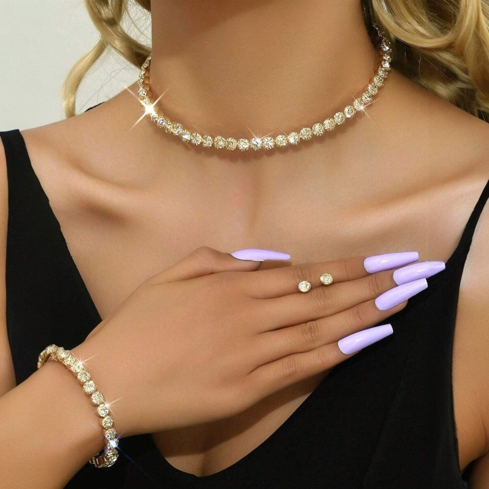 Fiecare apariție devine specială cu setul Dave, compus din colier tennis, brățară și cercei. Acest trio strălucitor adaugă un aer sofisticat și glam, perfect pentru evenimente, seri speciale sau ținute care cer un plus de rafinament. Realizat din aliaj metalic de calitate, setul este finisat într-o nuanță aurie caldă și împodobit cu pietre strălucitoare care captează lumina din orice unghi.